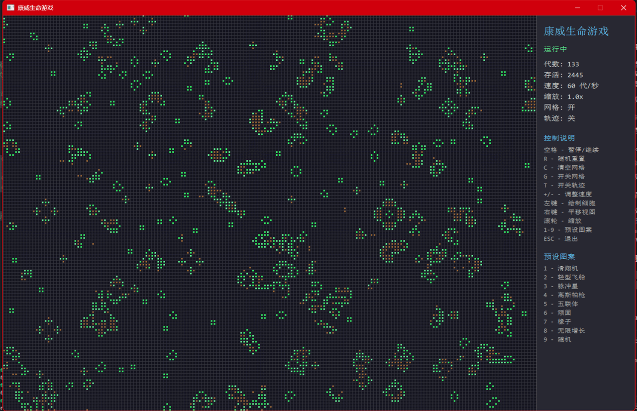 - 实时统计:显示代数、存活细胞数、速度等信息